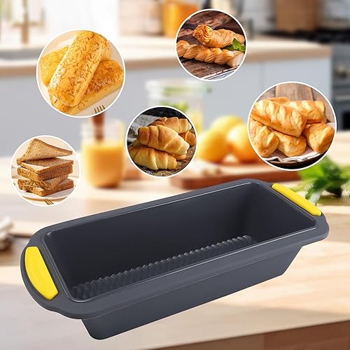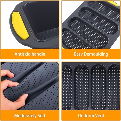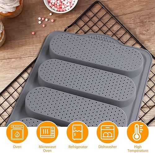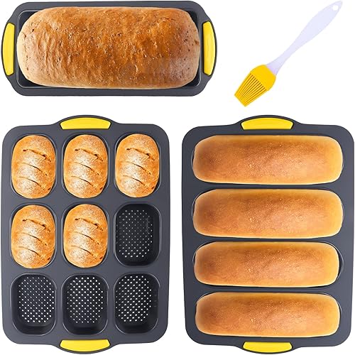 3 Pièces Silicone Moule a Baguette, Moule a Pain, Moule Perforé Antiadhésif, Plateau à Baguette 4 Grilles, Mini Baguette Plaque à Pâtisserie 9 Grilles, Avec Brosse à Huile, pour le Pain Français