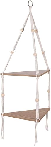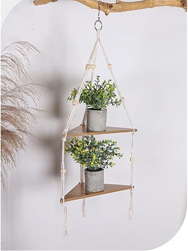 Étagère murale d'angle suspendue à 2 niveaux avec corde, étagères flottantes en bois, support de plantes bohème rustique, organisateur de rangement de ferme, étagères suspendues pour plantes, pots,