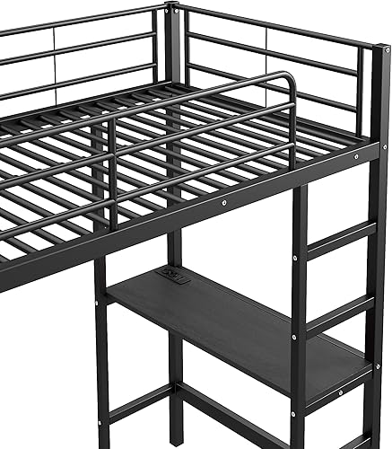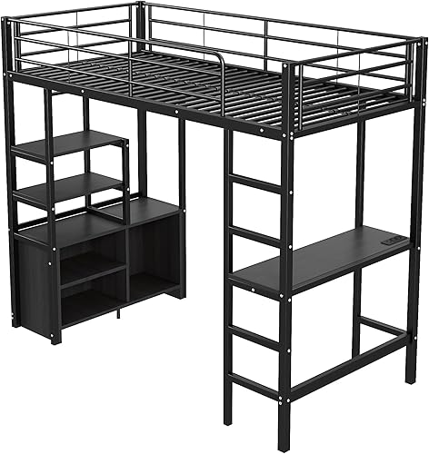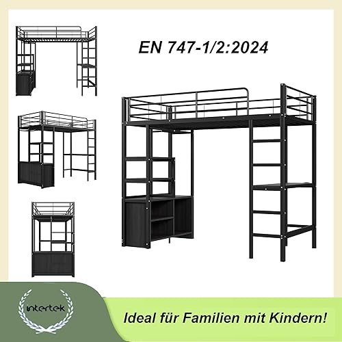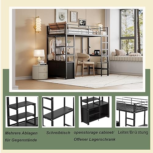 Merax Lit mezzanine, 90 x 200 cm, superposé, avec bureau, prise et USB, armoire et étagères, cadre de lit avec sommier à lattes (sans matelas), pour enfants et adultes, blanc