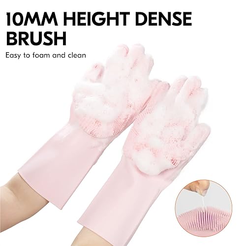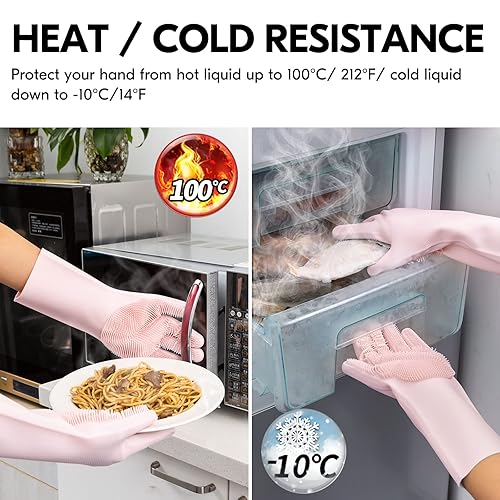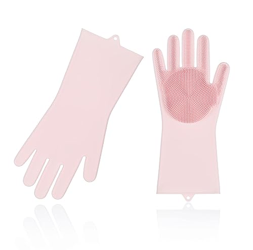 Vgo... Gants éponge de menage vaiselle, gants cuisine nettoyage réutilisables, brosse en silicone, gants de récurage, résistants à la chaleur (SI2142,Rose,9/L,1Paire)