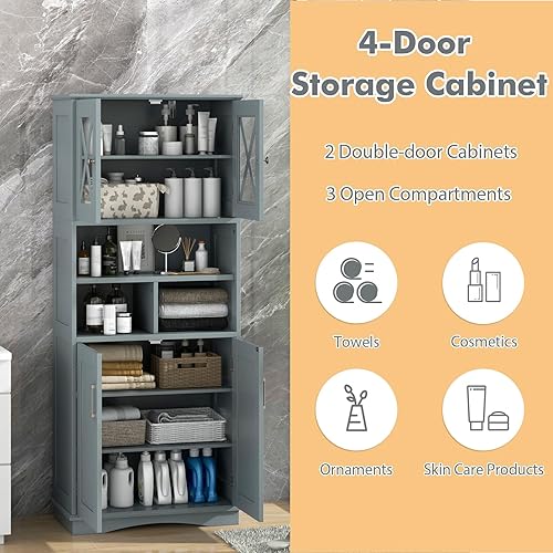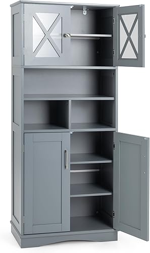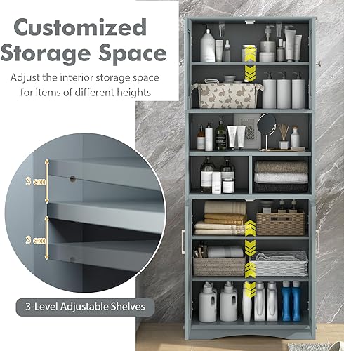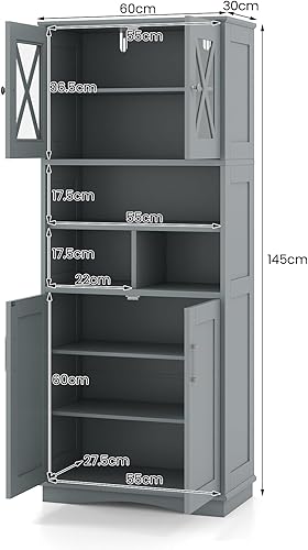 LIFEZEAL Meuble Salle de Bain Rangement à 4 Portes, Placard de Rangement avec Étagères Réglables, Armoire de Rangement à 7 Niveaux, 60 x 30 x 145 CM, pour Cuisine et Salle de Bains (Gris)