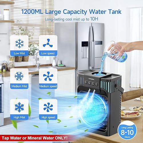 FethFire Climatiseur Mobile Silencieux avec Télécommande,1200 ML Mini Rafraichisseur d'air avec 3 Vitesses & 3 Brumes, 2-8H Timer,USB &7 LED,Petit Clim Mobile pour Chambre et Bureau(10W)
