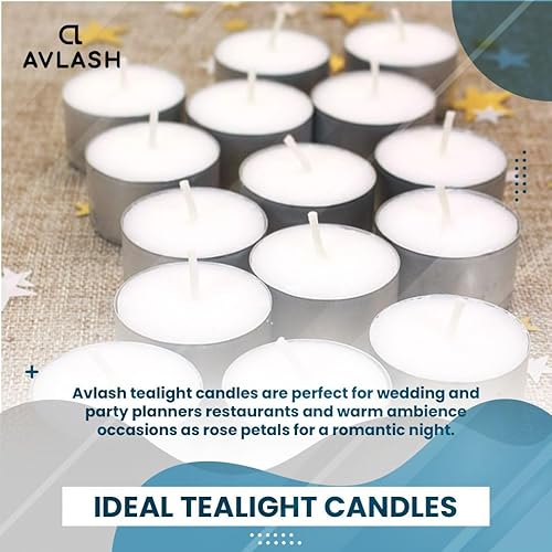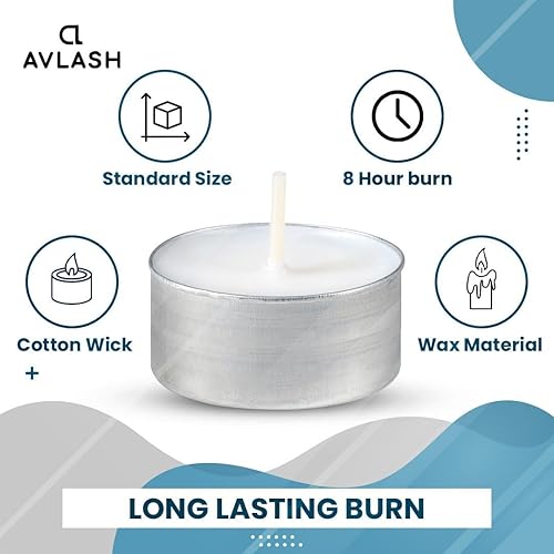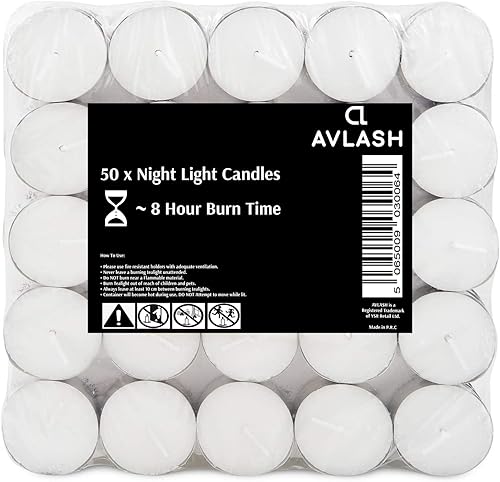 Avlash ® Lot de 50 bougies chauffe-plat 8 heures – 8 heures de combustion – Bougies chauffe-plat non parfumées emballées sous film rétractable – Blanc