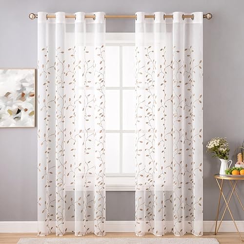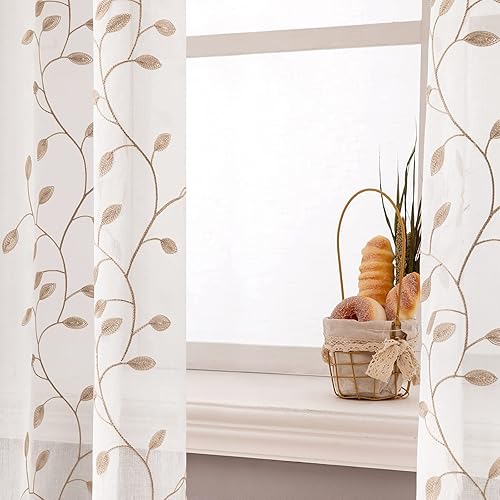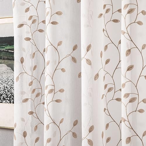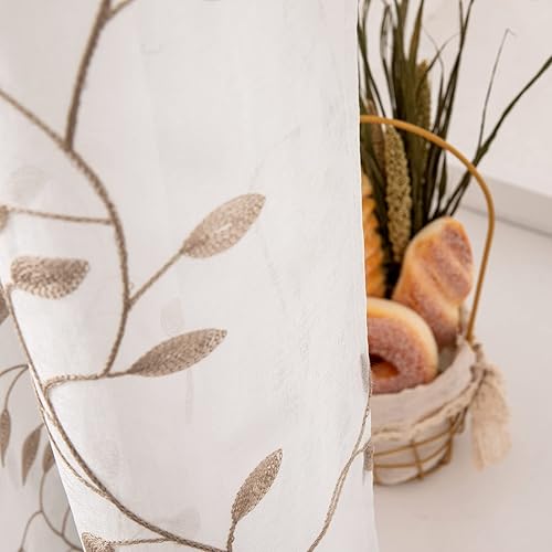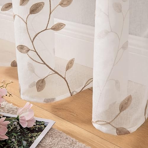 MIULEE 2 Voilages Marron Feuilles Brodées Window Rideaux Belle Élégance Oeillet Ressort Ressenteur Fenêtre Voile Panneaux Drapé Traitement pour Chambre Salon Feuilles Blanc 140 x 225CM(L x H)