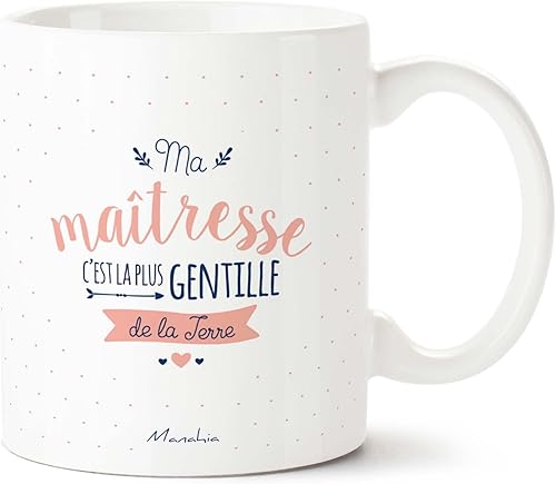 Manahia Mug Cadeau Maîtresse - Ma maîtresse c'est la plus gentille de la Terre - Avec Boite Kraft - Imprimé en France - 330 mL Céramique - Mug Ecole - Tasse Merci Maîtresse - Fête Année Scolaire