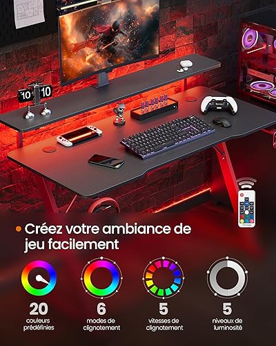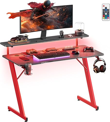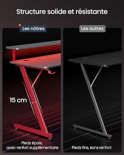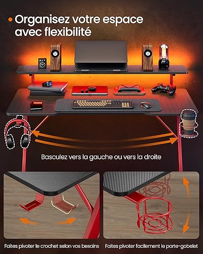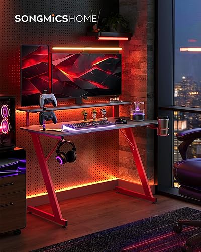 SONGMICS HOME Bureau de Jeu, avec Lumière LED, en Forme de Z, Support Moniteur, Porte-Gobelet, Crochet pour Casque, pour Bureau à Domicile, Noir Carbone et Rouge Rubis LWD099B01