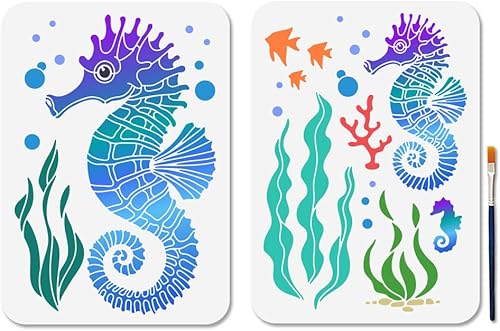 MAYJOYDIY 2 pochoir Hippocampe Bulles 21 × 29.7cm Plantes Aquatiques Corail Algues Poissons Tropicaux Dessin Pochoir Modèles avec Pinceau pour Maison Chambre D'Enfant