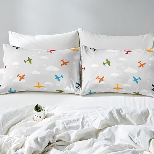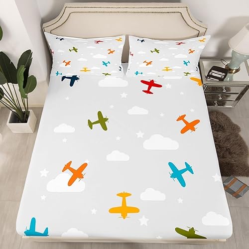 Drap Housse 140x190 Enfants Garçons Filles Draps Housse 2 Personnes Avion 3D Housse Matelas Grand Bonnet de 30 cm Drap-Housse Microfibre Doux avec 2 Taies D'oreillers 7032r