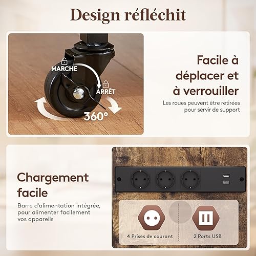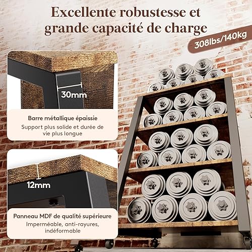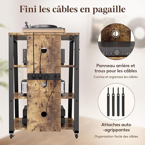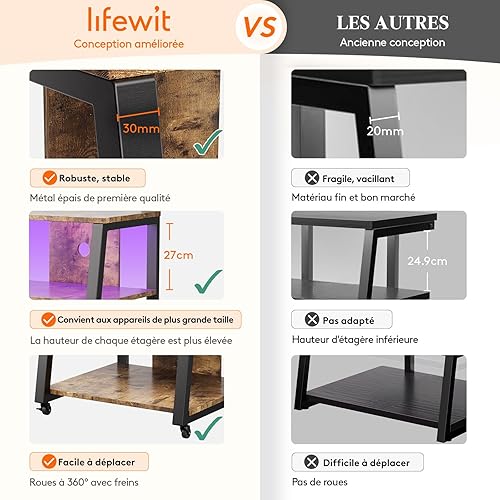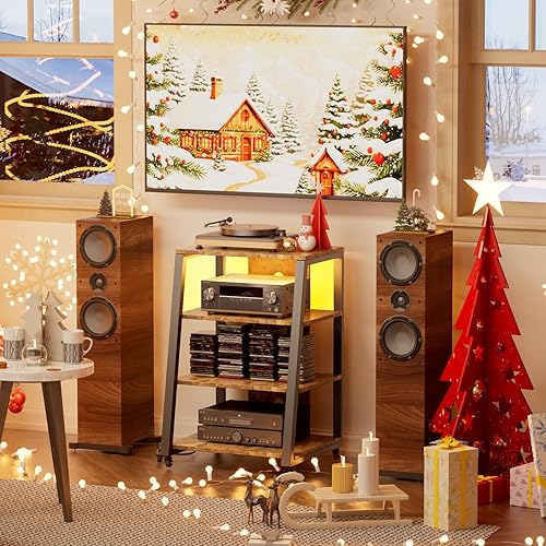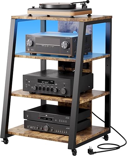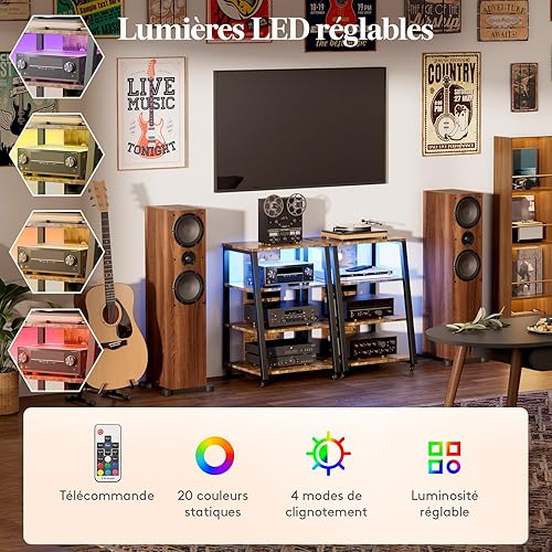 Lifewit Support multimédia audio à 4 niveaux avec multiprises et lumières LED, étagère AV en bois et acier pour platines disques, systèmes stéréo et installation compacte, marron