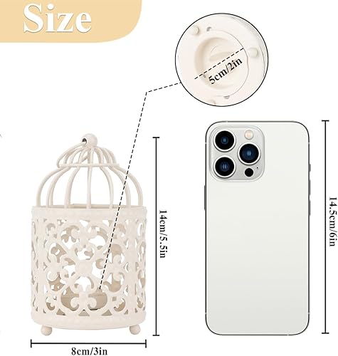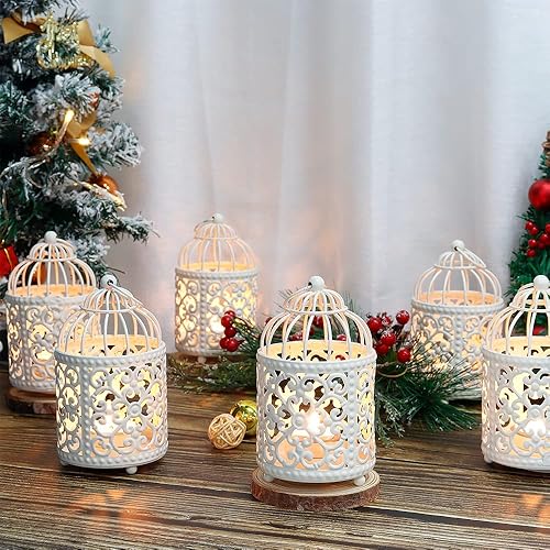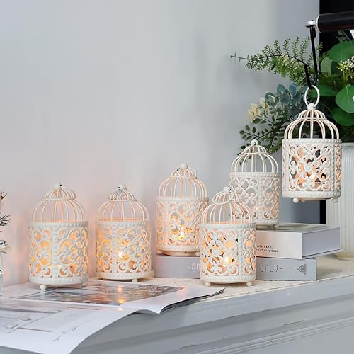JHY DESIGN Lot de 6 Centres de Tableau de Mariage 14 cm de Haut Petit Bougeoir Métal à Suspendre en Forme de Cage à Oiseaux Lanterne Creuse pour Table Saint-Valentin Intérieur Extérieur (Blanc)