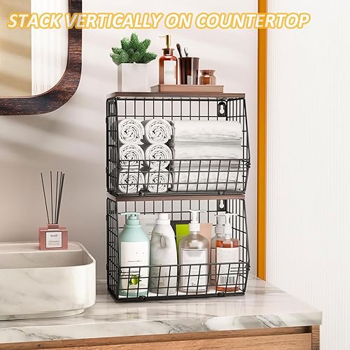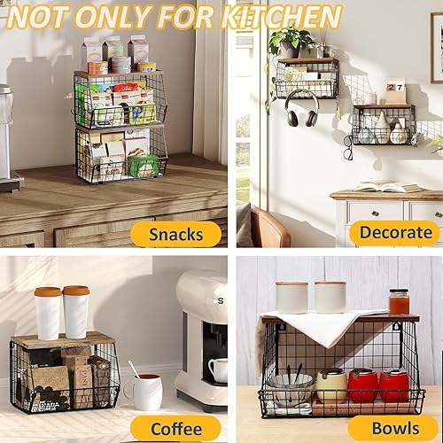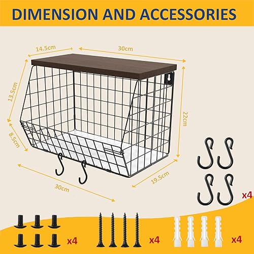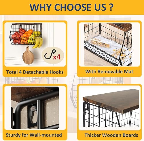 Hykiee Corbeille a Fruit, 2pcs Panier Fruit Suspendu Mural, Corbeilles à Fruits Organiseurs de Cuisine avec Couvercle en Bois, Metal Rangement Fruits et Légumes Cuisine Anti Moucheron Empilable