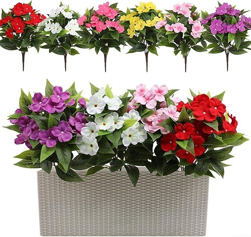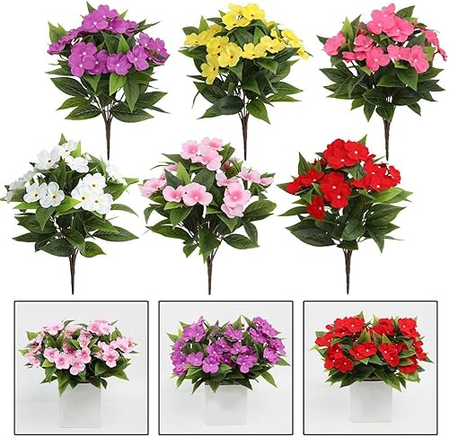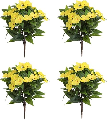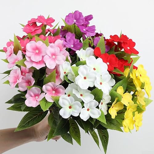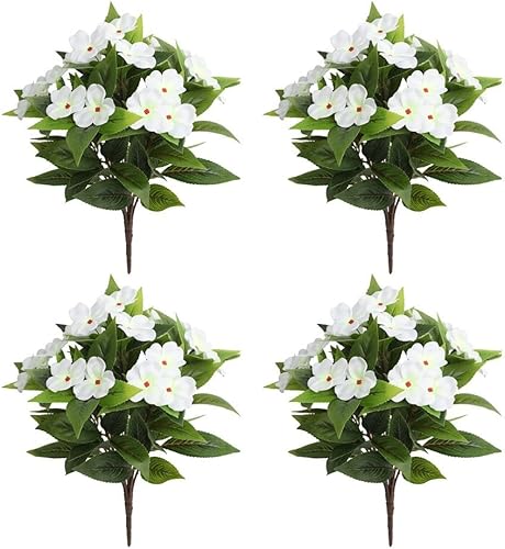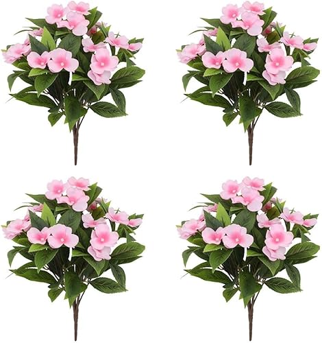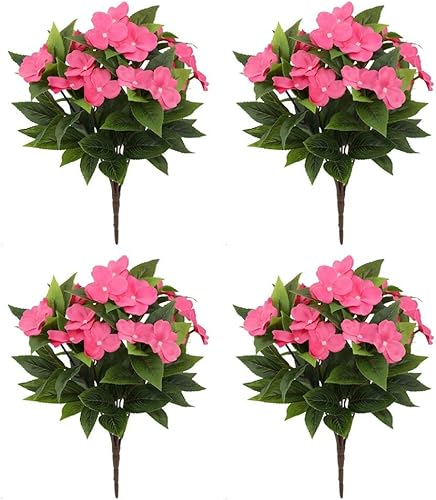 MeevrgR Impatiens artificiels – 40 cm – Faux rhododendrons résistants aux UV (5 couleurs) – Lot de 4 pour paniers suspendus et décoration d'extérieur (rose rouge)