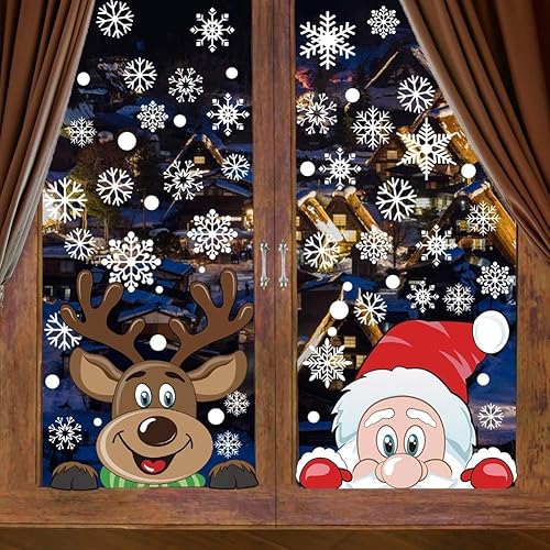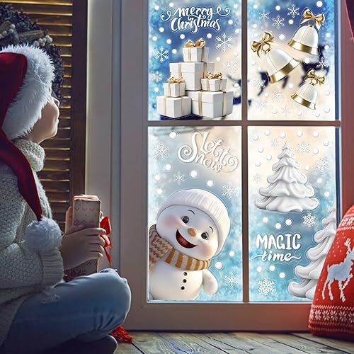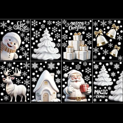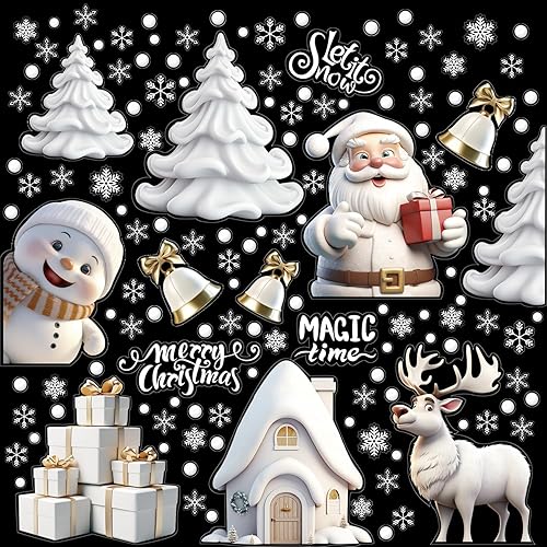 DERAYEE 8 Feuilles Sticker à Effet Stéréoscopique Blanc,Noël Autocollant Fenêtre Réutilisable,Stickers Noël Fenetre PVC,Flocons de Neige Père Noël,Renne,Cloches