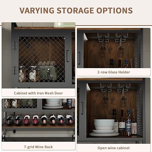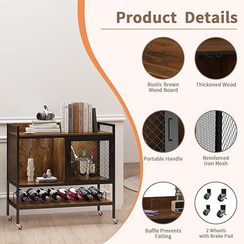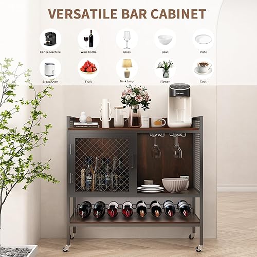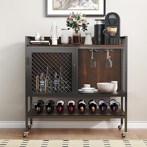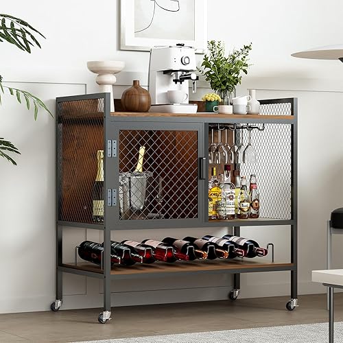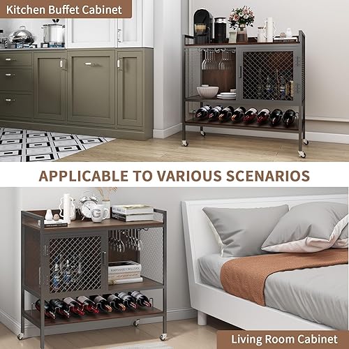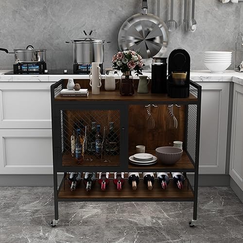 DAWNYIELD Buffet de Cave à vin à 3 Niveaux, Table de Bar avec roulettes, casier à vin, Porte-Verres à Pied, Porte en Maille, Armoire de Rangement de Cuisine Industrielle (Vintage)