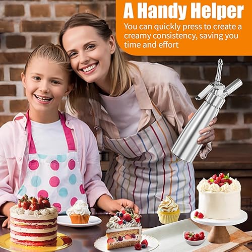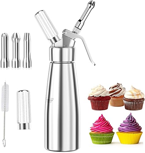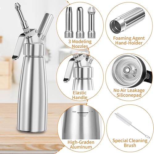 500ml Siphon Crème Chantilly Sans Fuite Professionnel, Syphon Crème Aluminium avec 3 Douilles Acier Inoxydable et 1 Brosse Nettoyage, Siphon Cuisine pour Gâteaux, Desserts, Mousses, Pâtisserie, Glacée