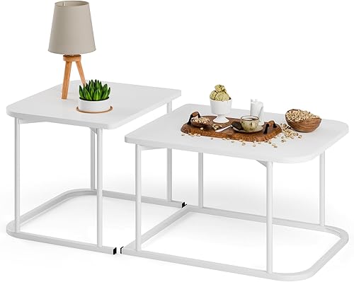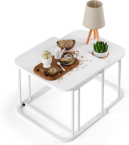Lot de 2 tables basses gigognes rondes et carrées en 2 tailles, table basse combinée, style crème, table d'appoint de salon, table d'appoint de canapé pour salon, bureau à thé, gain de place (blanc)