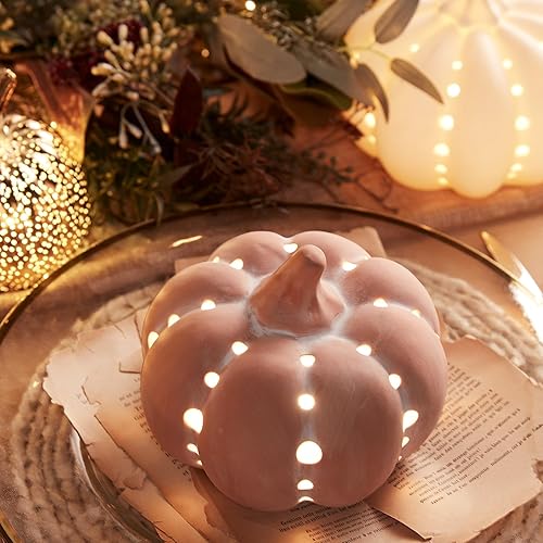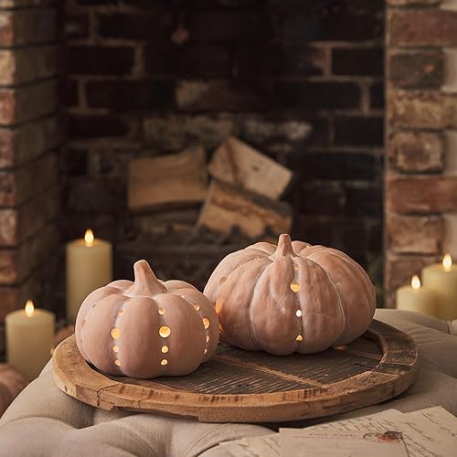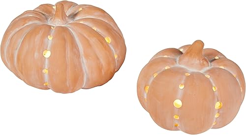 Lights4fun Lot de 2 Citrouilles en Terracotta avec LED Blanc Chaud à Piles pour Intérieur et Extérieur