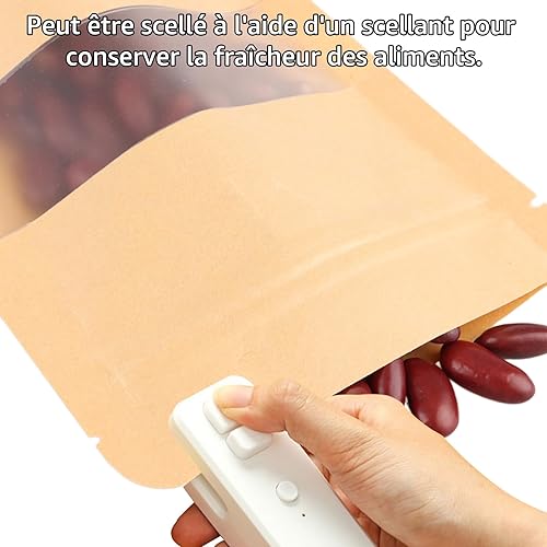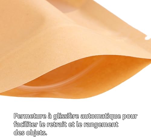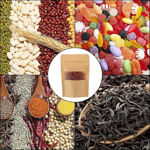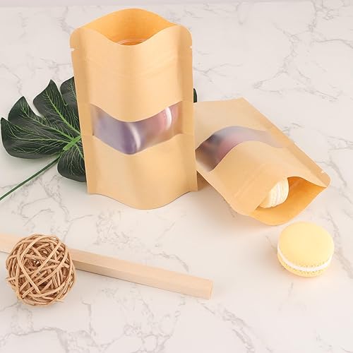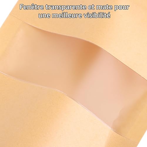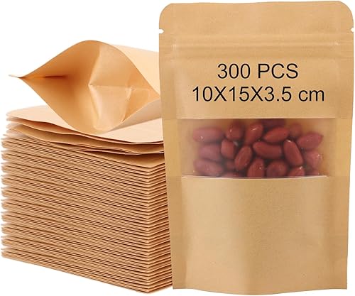 AKOLAFE Lot de 300 sacs en papier kraft avec fenêtre - 10 x 15 cm - Marron - 3,5 cm d'épaisseur - Hermétiques - Pour bonbons, noix, grains de café, épices, feuilles de thé