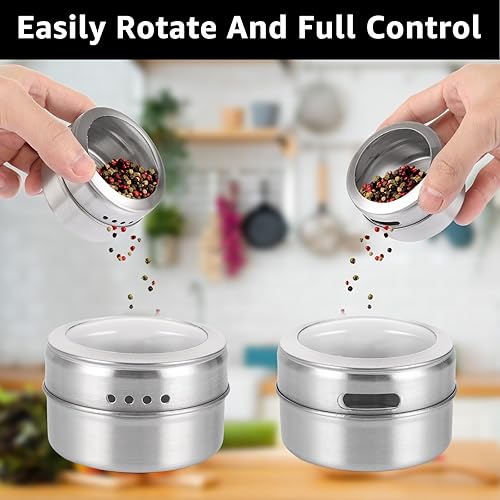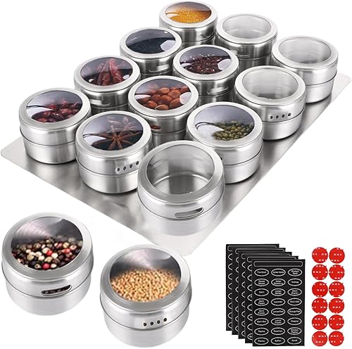 APACALI 12pcs Pots à Épices Magnétiques, Bocaux à Épices en Acier Inoxydable avec base murale et Trous Réglables, Boîtes à Épices Cuisine Magnétiques avec Étiquettes