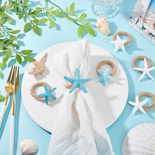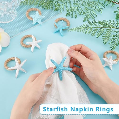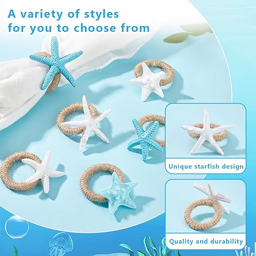 AHANDMAKER Lot de 6 ronds de serviette en forme d'étoile de mer - 6 styles - Pour travaux manuels, plage, mariage, fête à thème, banquet - Blanc et bleu