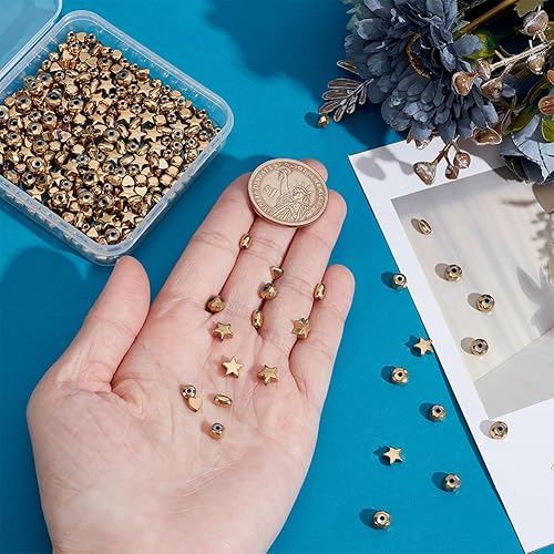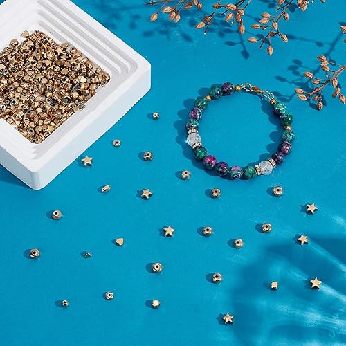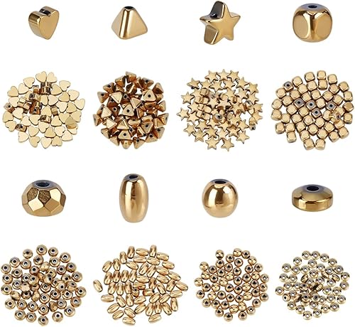 CRAFTYMELODY 400 pièce 8 styles de Perles D'Espacement Plaquées Or 18 carats Perles D'Hématite Assorties Perles Dorées Perles en Métal en Vrac Étoile Ovale Rondelle Pyramide Cœur