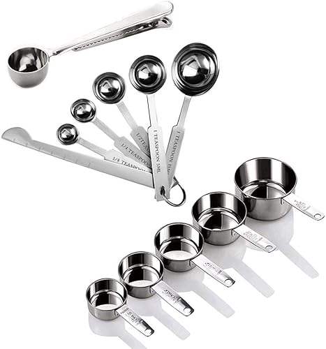 Vegena Ensemble Cup Mesure et Cuillères doseuses, Cuillères et Tasses à mesurer en Acier Inoxydable avec Mesure Règle,5 Tasses à mesurer,5 cuillères doseuses avec Règle,1 Scoop avec Clip, Lot de 12