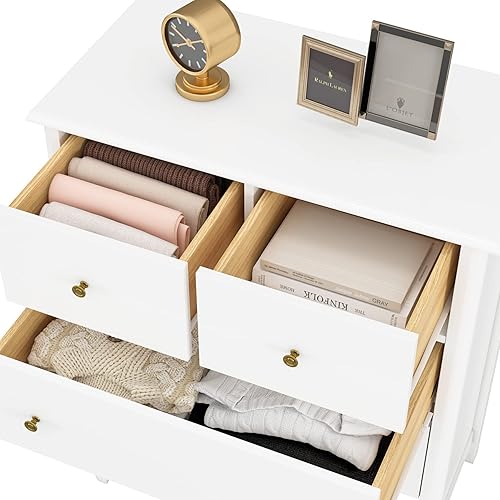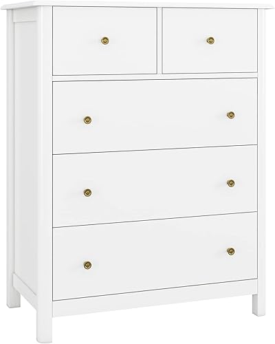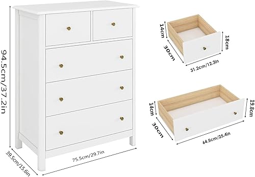 HOCSOK Commode Blanche à 5 tiroirs, Meuble de Rangement Chambre en Bois pour Bureau, Salon ou Chambre à Coucher, 75,5 x 39,5 x 94,5 cm, Blanc, (MD043)