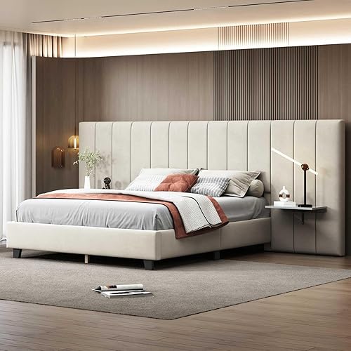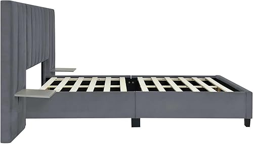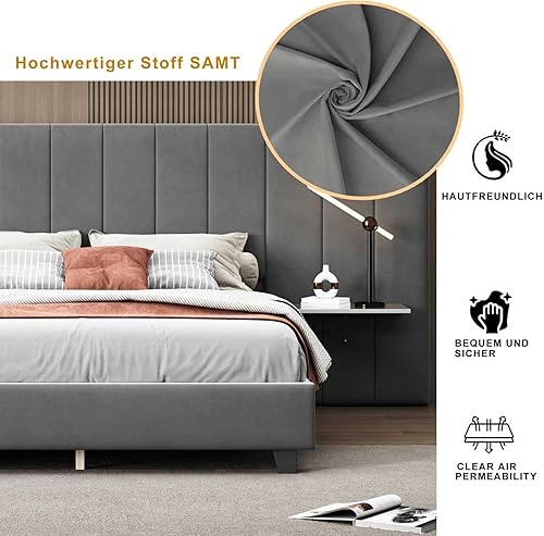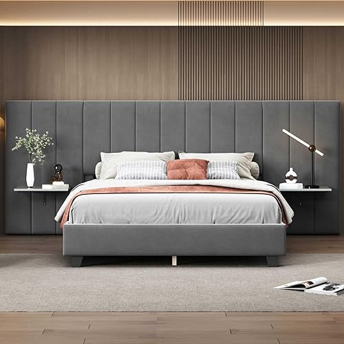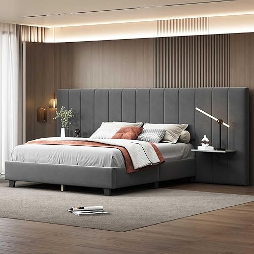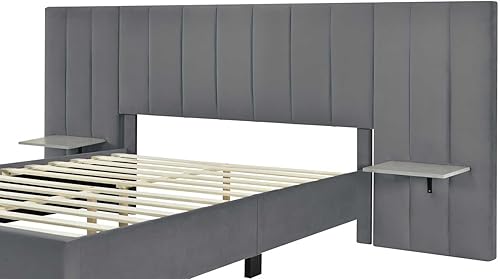 YEHTOKHOME Lit capitonné Multifonctionnel avec tête et Dossier allongés,Moderne Double lit avec sommier à Lattes,Tête avec étagères des Deux côtés, Tissu Velours(sans Matelas) (Gris, 160x200cm)