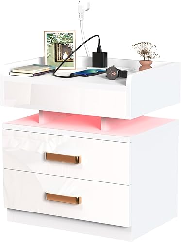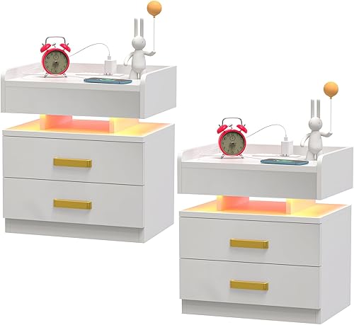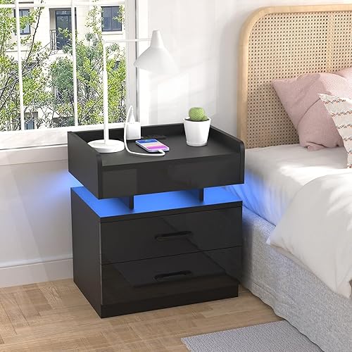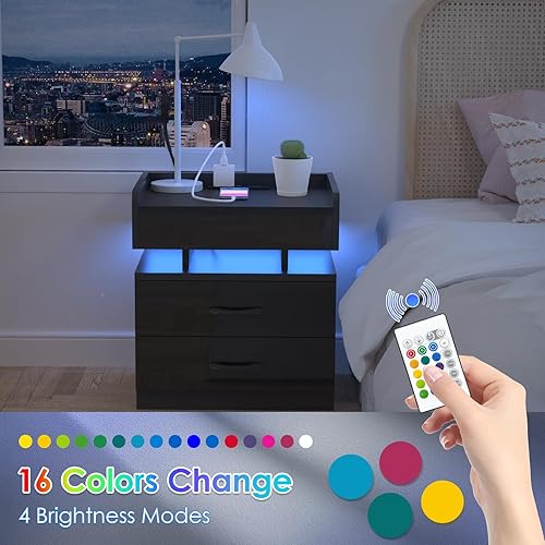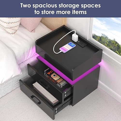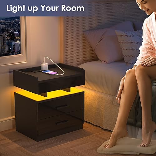 CHOWGOLI Lot de 2 Tables de Chevet LED avec Prise et Fonction de Charge, Table d'appoint avec 2 tiroirs, Grand Espace de Rangement, Stand de Nuit pour Chambre à Coucher, Salon, Table de Chevet - Noir