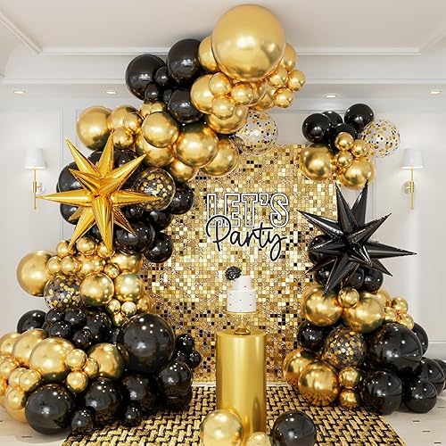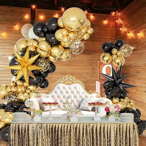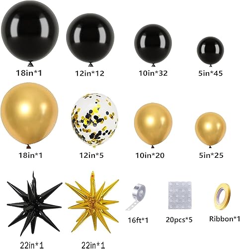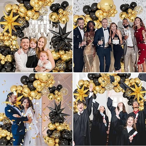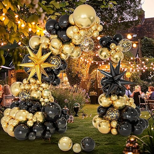 CboDeco Kit d'arche de ballons noirs et dorés pour remise de diplôme, anniversaire, fête du Nouvel An, 146 ballons noirs et dorés en forme d'étoile explosive, ballons en latex de 45,7 cm, 30,5 cm