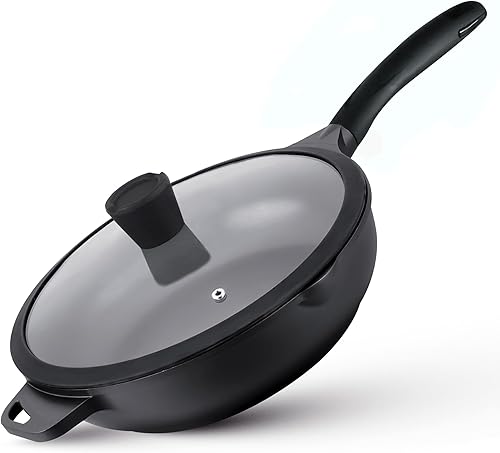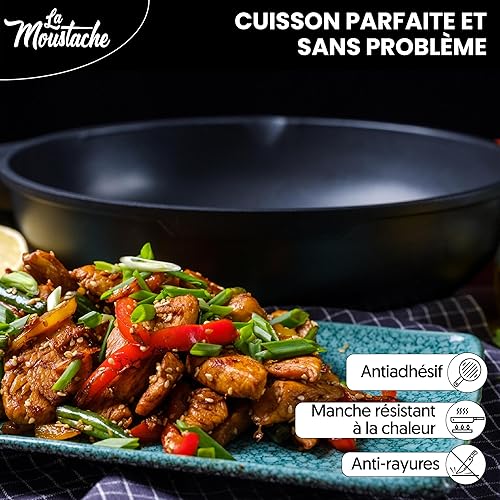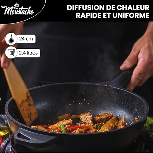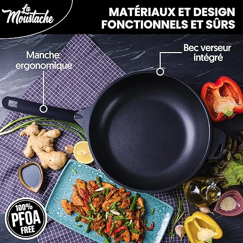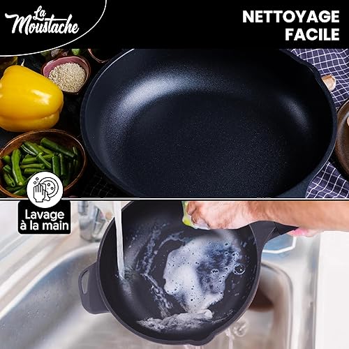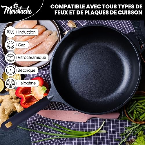 La Moustache - Poêle à Frire Fonte d'Aluminium Antiadhésives 24 cm, Couvercle en Verre, sans PFOA | Fonctionne sur Halogène, Gaz, Electricité, Induction et Vitrocéramique (Klyve)