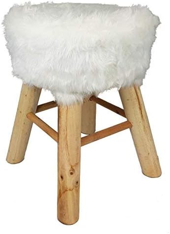 Spetebo Tabouret design en fourrure blanche – Tabouret rond en bois massif – Tabouret rembourré en bois