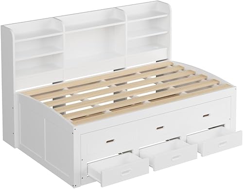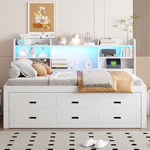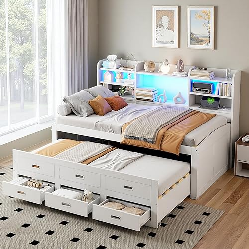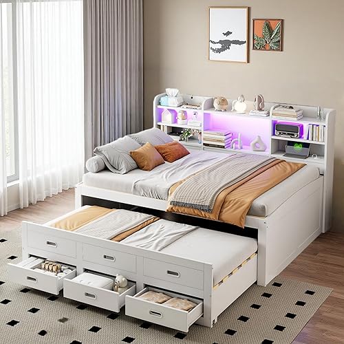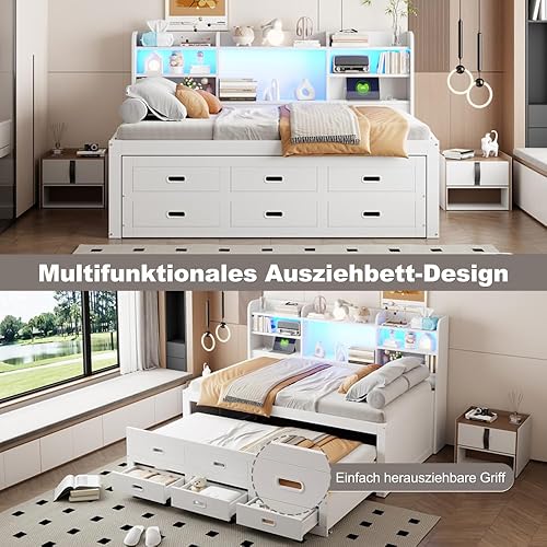 Seyakany Canapé lit 140 x 200 cm avec télécommande LED et Port de Charge USB&Type C,Lit Enfant 140x200 avec lit gigogne et 3 tiroirs,sans Matelas,Blanc