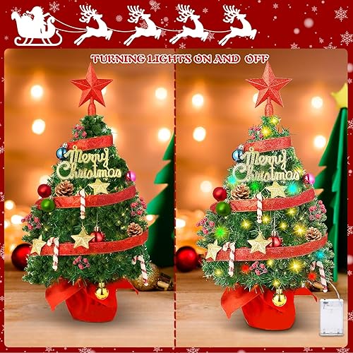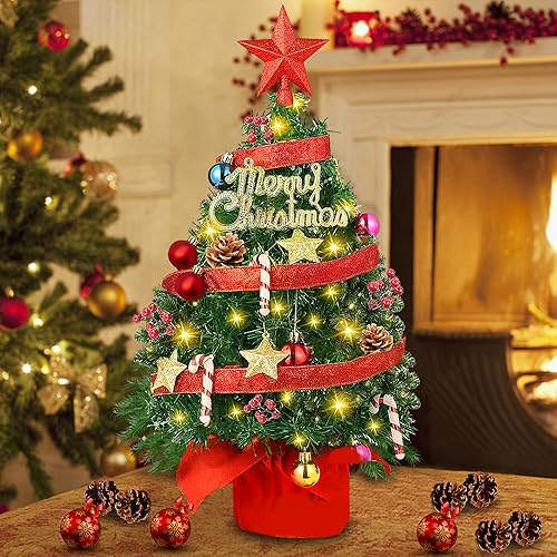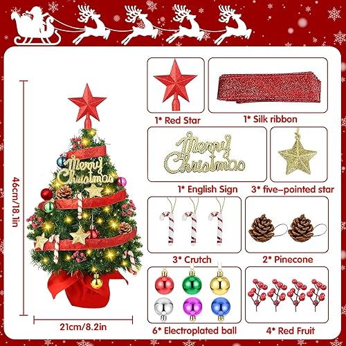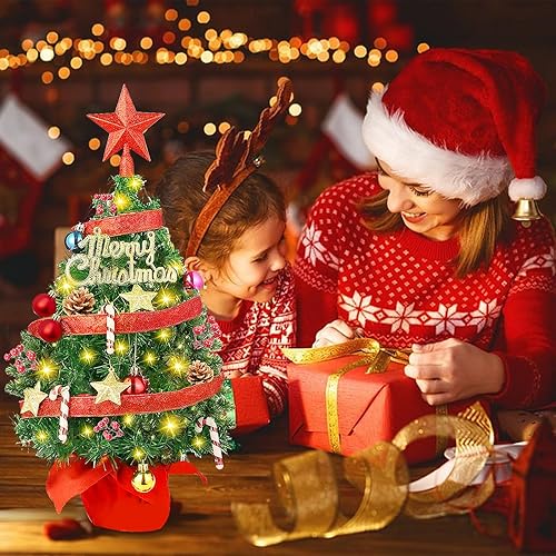 MWZEAUL Petit Sapin de Noël Lumineux 50 cm, Mini Sapin de Noël Artificiel avec 30 LED Guirlande Lumineux et Ornements, Étoile Sommet Rouge Arbre de Noël Decoration Intérieur Sapin de Noël pour Table