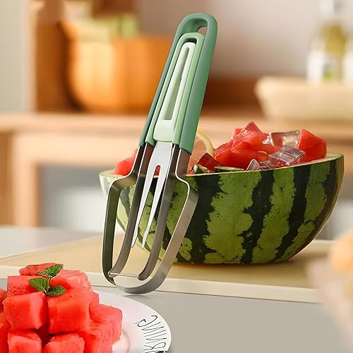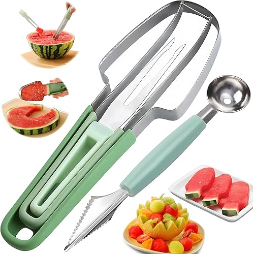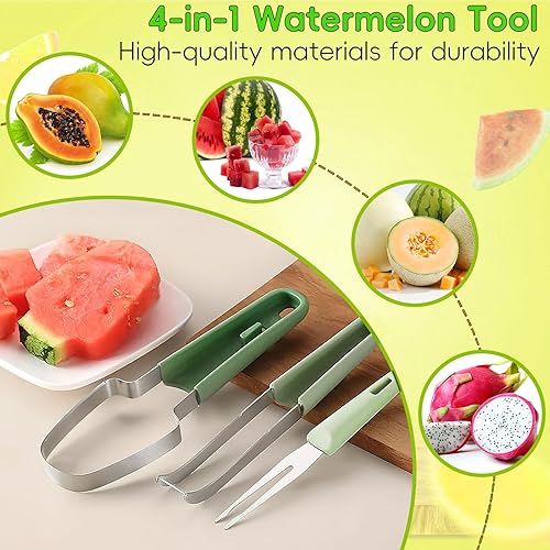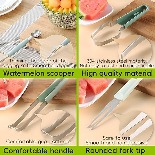 Defvnst Trancheuse à pastèque 5 en 1, kit de coupe-melon en acier inoxydable, portable, fourchette à melon, cuillère coupe-fruits pour cantaloupe, papaye, fruits du dragon (vert)