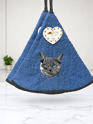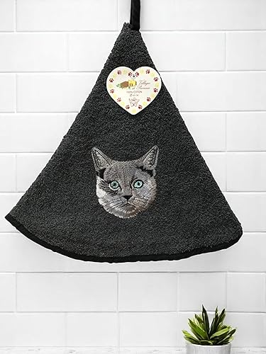 Torchon Essuie Mains Brodé Chat - Essuie Mains Cuisine Rond avec Attache - Motifs Brodés - 100% Coton - Ø 65 cm de diamètre - Lavable en Machine (Gris, Unité)