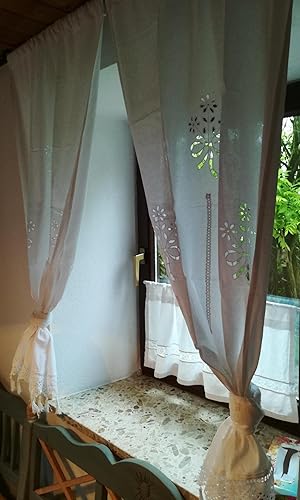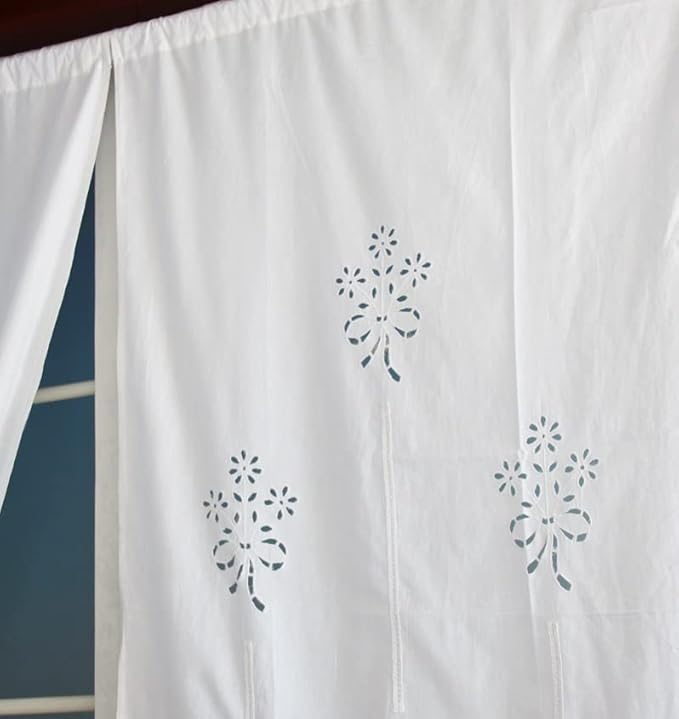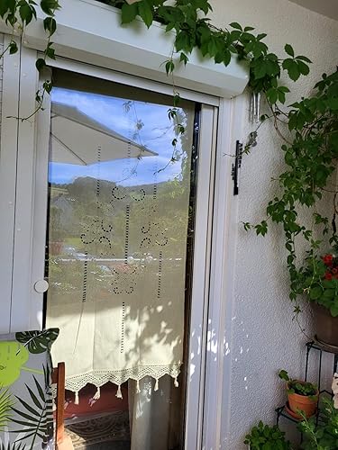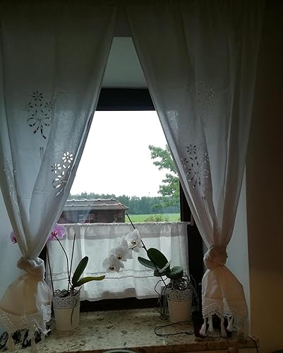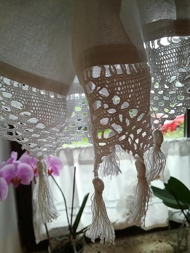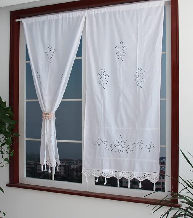 Yulakes Rideau de cuisine, en lin blanc, en coton, brodé, rideau de cuisine, rideau de café, rideau coulissant, rideau de salle à manger, avec bordure à gland crochet, 70 x 150 cm (1 pièce)