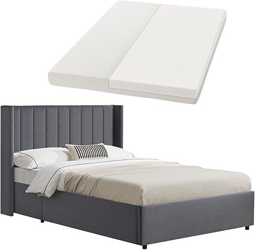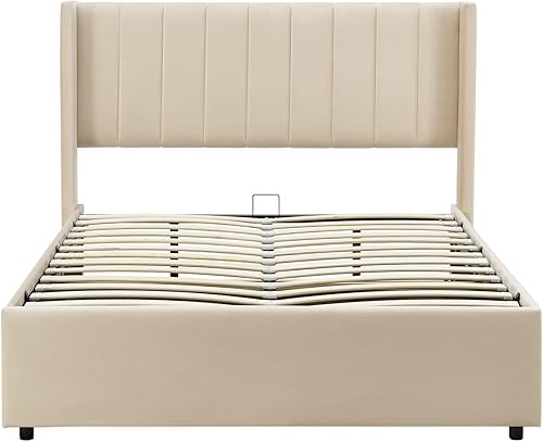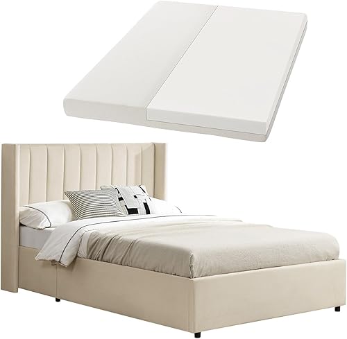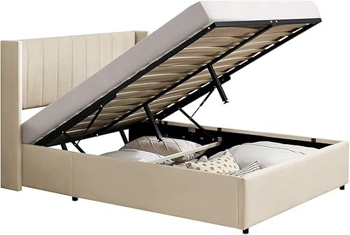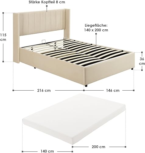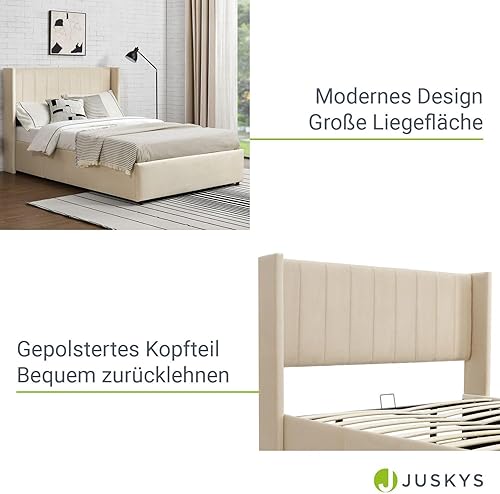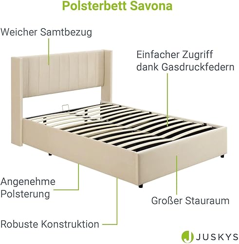 Juskys Lit rembourré Savona 120x200 cm avec Coffre, sommier à Lattes, Matelas, Housse en Velours, Cadre de lit en Bois, jusqu'à 250 kg, Grande tête de lit, Beige