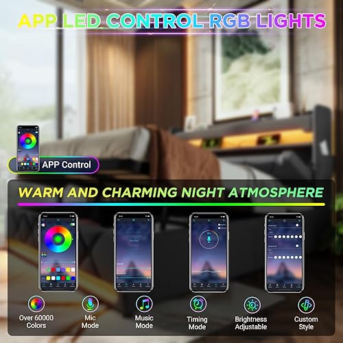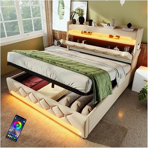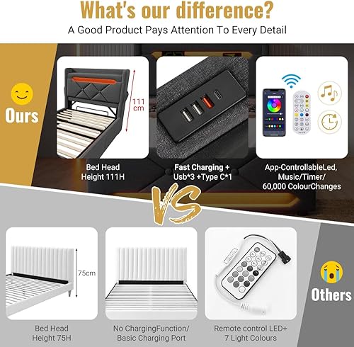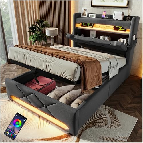 OOIILLEE Lit Double 180 x 200 avec sommier, Cadre de lit avec Port USB et Type C, éclairage LED, lit Coffre avec hydraulique, Gris, Lin (sans Matelas)