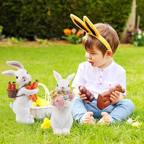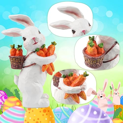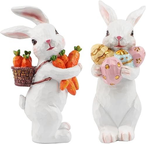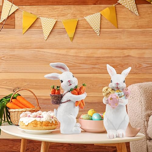 Jangostor 2 Pièces Décorations de Lapin de Pâques Statues et Figurines de Lapin de Pâques avec Carotte et Oeuf,Pièce Maîtresse de Table de Pâques Lapin en Résine pour Printemps de Fête Bureau Décor