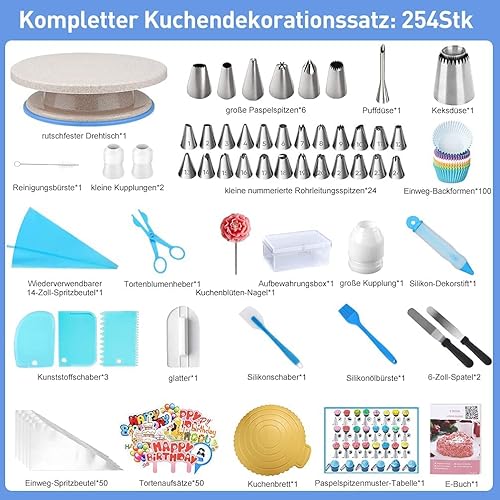 Rafow Kit de Pâtisserie Professionnel - Ustensiles à Pâtisserie 254 Pcs avec Plateau Tournant de Gâteau/Douilles Pâtisserie/Spatules - Kits de Décoration de Gâteaux pour Glaçage