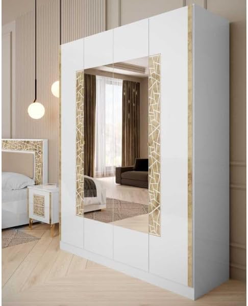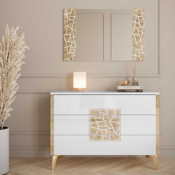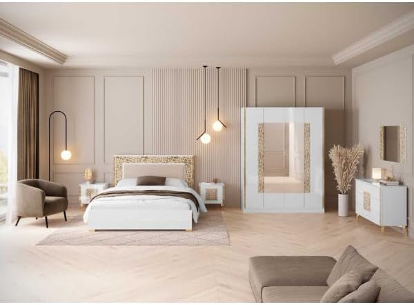 Chambre complète 160x200 Blanc brillant/Or - NAHESA - Cadre de lit : L 168 x l 215 x H 112 cm ; Armoire : L 162 x l 53 x H 212 cm ; Commode : L 108 x l 41 x H 77 cm ; Chevet : L 52 xl 37 x H 54 cm ;
