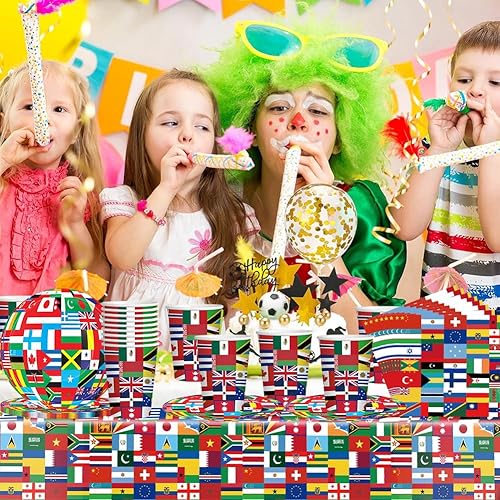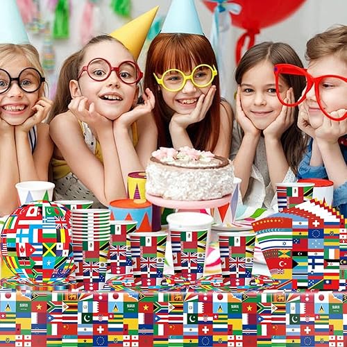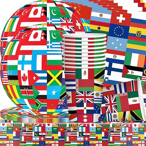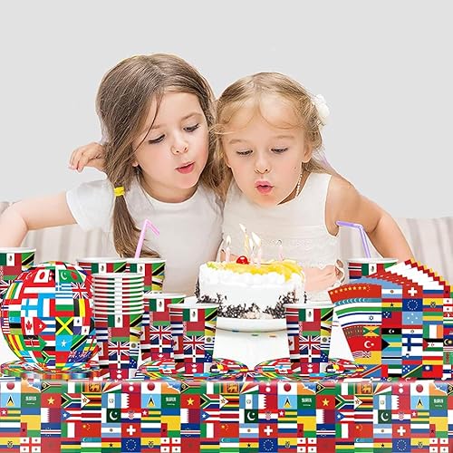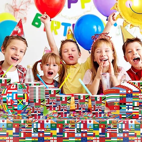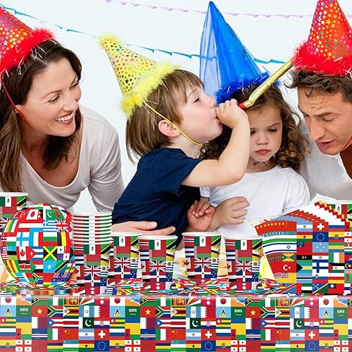 Drapeaux du monde vaisselle,41PCS de vaisselle d'anniversaire avec drapeau international, Décorations de fête à thème international, assiettes,Serviettes en papier, gobelets en papier,Nappe, 10Invités