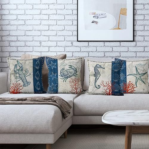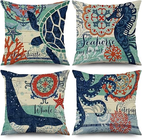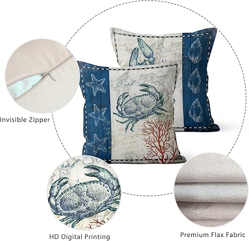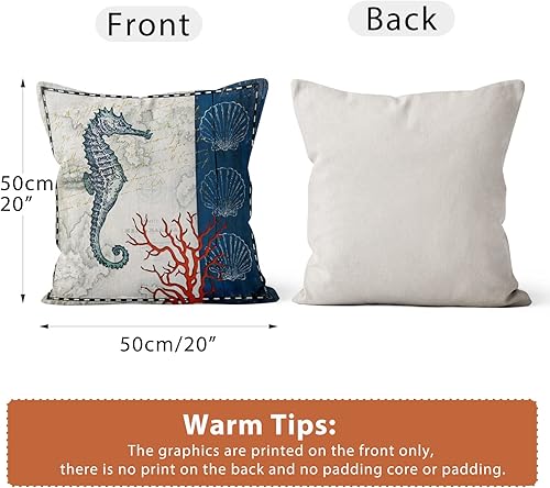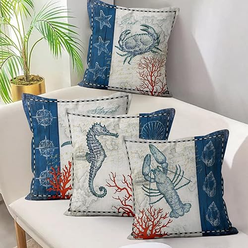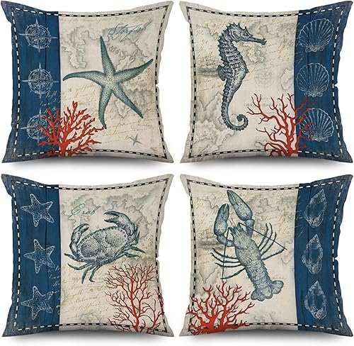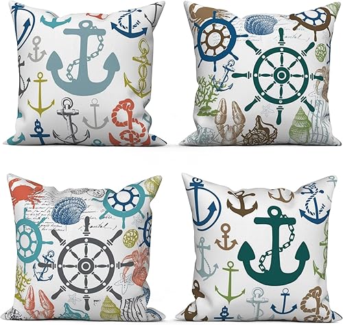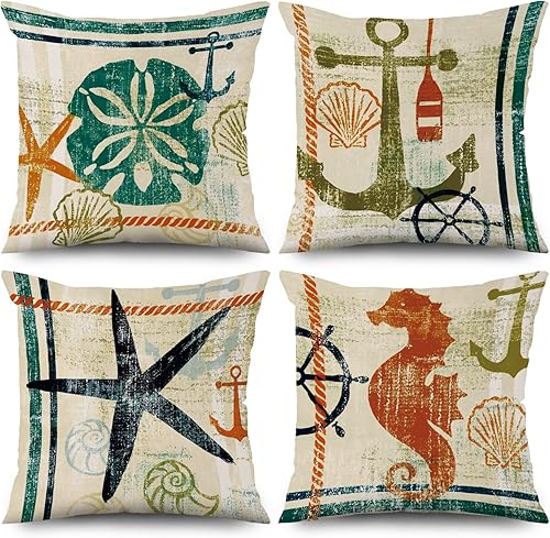 ASDCXZ Housses de Coussin Maritime 40x40 cm, Lot de 4 Ancre Maritime Boussole de mer Plage de Sable Blanc canapé Coussin Housses de Coussin Lavable Lin Textile Taie d'oreiller