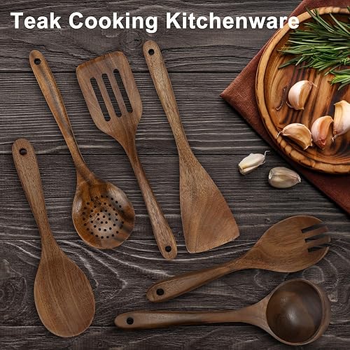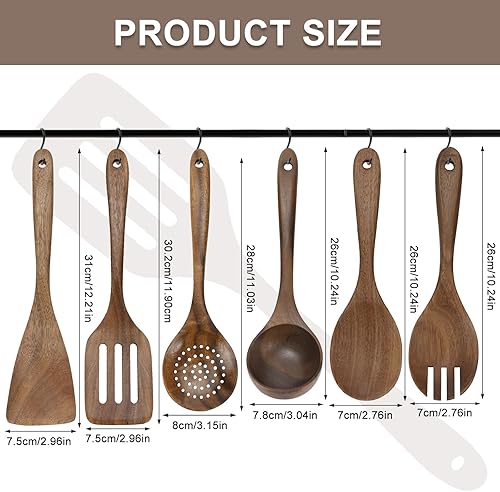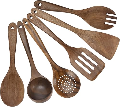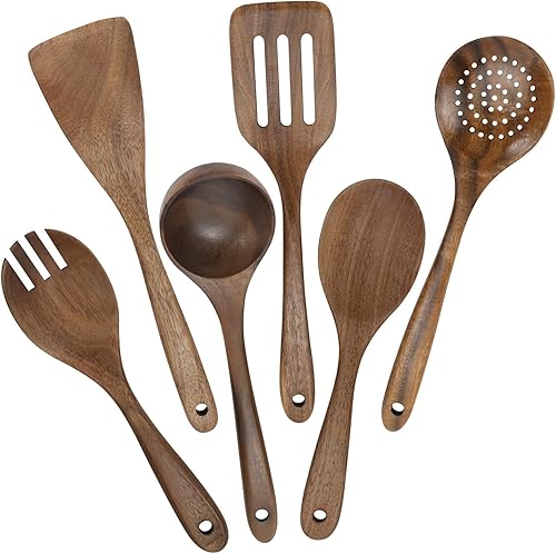HMIEPRS 6 Pièces Ustensiles de Cuisine Bois, Antiadhésifs Naturel Cuillères en Bois, Résistant à la Chaleur Essentials Set d'ustensiles de Cuisine, Cuillères Fourchette et Spatule pour la Cuisine