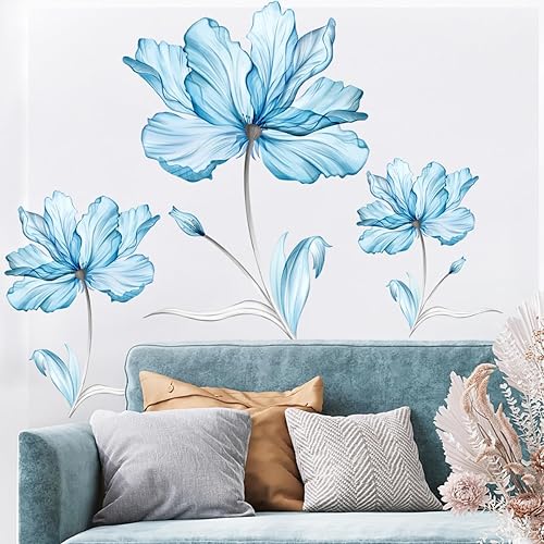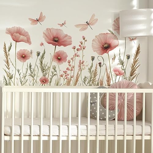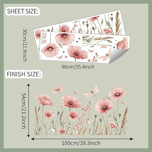 Stickers Muraux Coquelicot Aquarelle, Autocollants Muraux Libellules Fleurs Roses, Décoration Murale pour Chambre Salon Salle de Bain