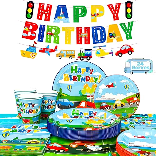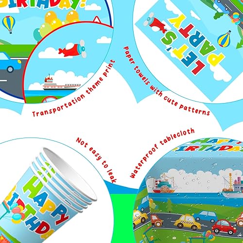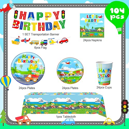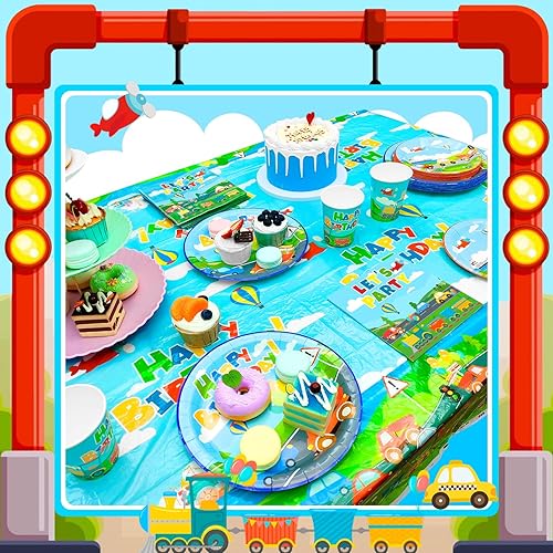 Décorations de fête D'anniversaire de Transport ,104pcs Transport Vaisselle de fête -Thème Bannière, Nappe, Tasses, Serviettes &Assiettes à Thème Décorations Fournitures de Transport