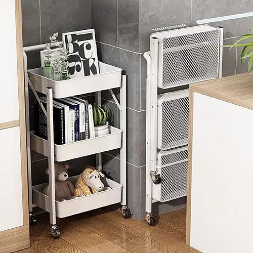 Megashopitalia Chariot de Cuisine Pliable Multifonction avec poignée 3 étagères, paniers 4 roulettes et Frein intégré en métal, Chariot économise de l'espace, Blanc