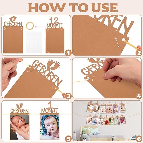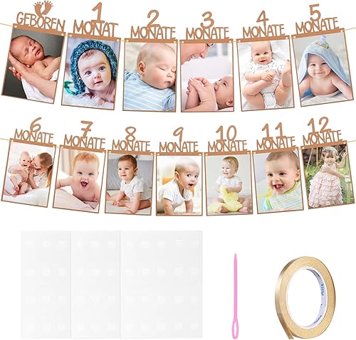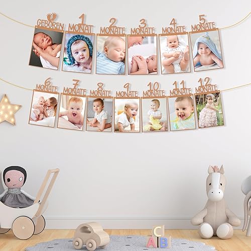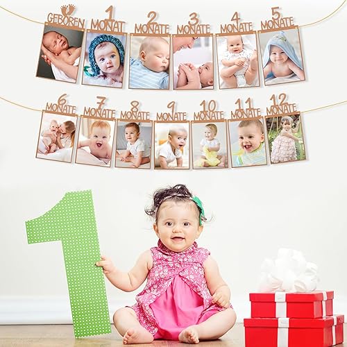 MeiHongJiaYe Bannière Photo 1er Anniversaire Bébé 1 à 12 Mois, Décoration Murale Suspendue, Guirlande Photo pour Fête 1 An, Décoration Baptême Garçon/Fille (Marron)