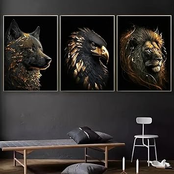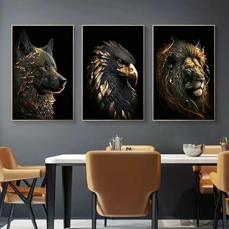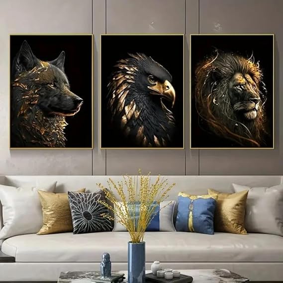 Muholin Lot de 3 affiches représentant un loup doré,un aigle doré,un lion,une toile murale,pour décoration de salon ou de chambre à coucher 50x70cmx3 sans cadre